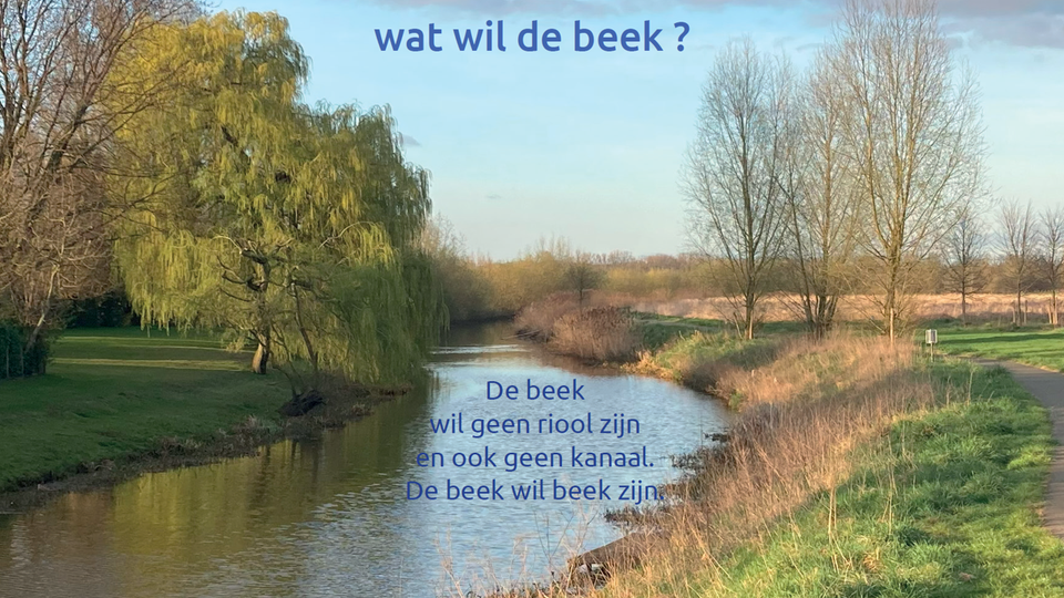 De Aa of Weerijs ontspringt achter mijn huis in Wuustwezel, in natuurgebied Klein en Groot Schietveld. Ze stroomt van zuid naar noord door de gemeente Zundert, voor wie ik werk. Vanaf daar via Mark en Dintel naar het Volkerak. Ik woon al 25 jaar langs het water van deze beek, op verschillende plekken. Maar wat wil de beek? Ze wil geen kanaal zijn en ook geen riool. De beek wil weer kronkelen van plezier en schoon, drinkbaar water naar het land brengen. Dat is mijn droom, voor de beek. En voor het land. En voor de bron.